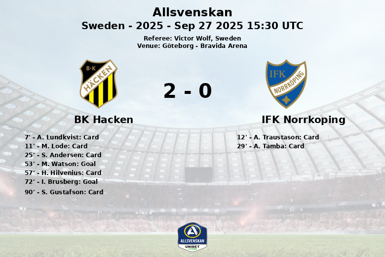 El segundo tiempo comenzó con cambios en ambos equipos. El BK Hacken se benefició de un autogol de M. Watson del IFK Norrkoping al minuto 53 para abrir el marcador. Más tarde, I. Brusberg del BK Hacken ampliaría la ventaja en el minuto 72, con asistencia de J. Lindberg, asegurando la victoria para su equipo. A pesar de tener menor posesión del balón (46% frente al 54% del IFK Norrkoping), el BK Hacken mostró mayor efectividad en el ataque, registrando 17 tiros en total, de los cuales 6 fueron a puerta. El IFK Norrkoping, por su parte, solo logró 3 tiros, con 1 a puerta. El árbitro del encuentro, Victor Wolf, mostró un total de siete tarjetas amarillas durante el partido. La victoria consolida la posición del BK Hacken en la Allsvenskan.