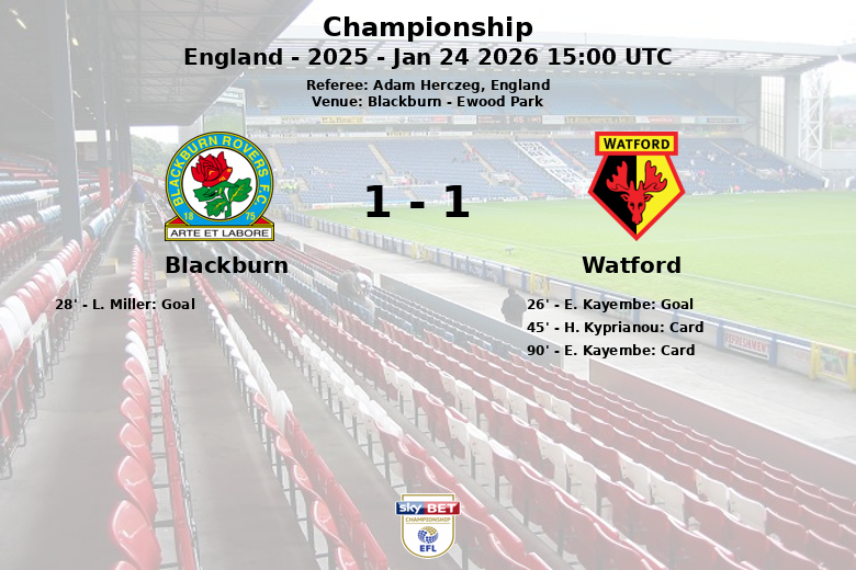 Blackburn y Watford protagonizaron un encuentro disputado en Ewood Park, que finalizó en empate tras un partido lleno de intensidad. El Watford se adelantó en el minuto 26 gracias a un gol de E. Kayembe, tras una jugada elaborada. La alegría de los visitantes duró poco, ya que L. Miller igualó para el Blackburn apenas dos minutos después, asistido por T. Cantwell.