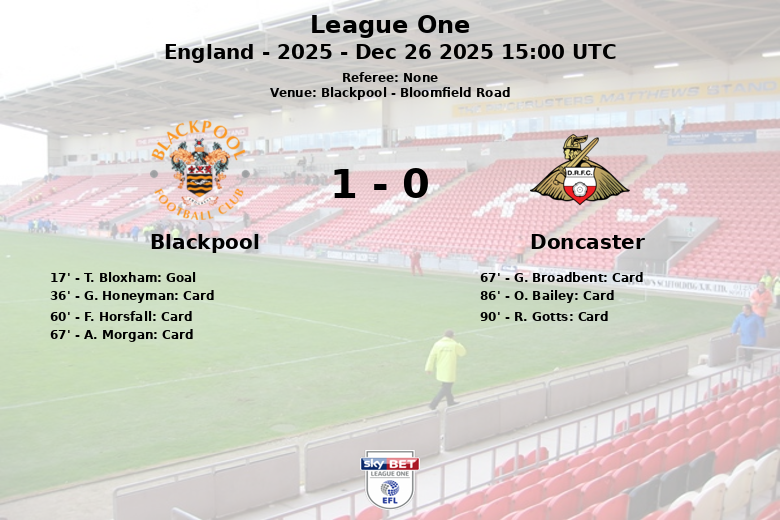 El encuentro se abrió temprano con un gol de T. Bloxham a los 17 minutos, tras una asistencia de D. Imray, que adelantó a Blackpool en el marcador. A pesar de los intentos de Doncaster por igualar el partido, la defensa de Blackpool se mantuvo sólida.