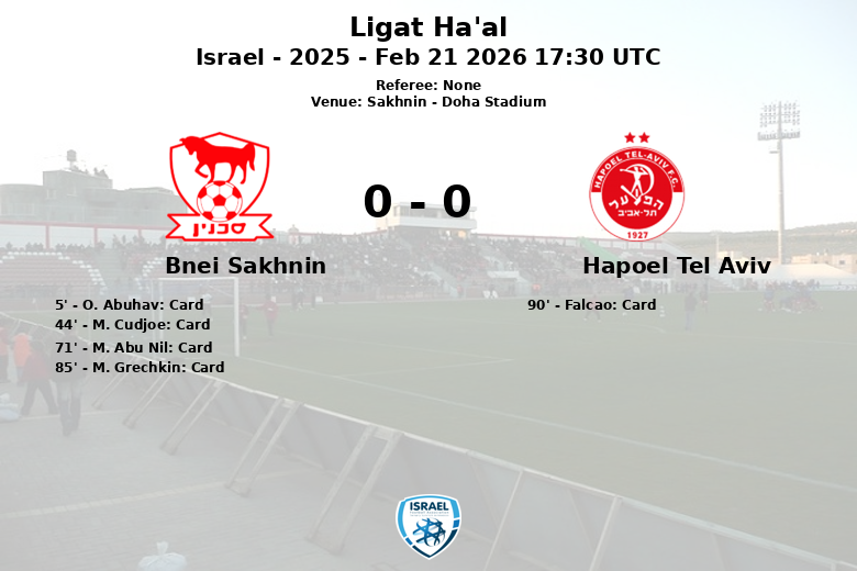 El partido se caracterizó por un alto número de faltas, 14 por parte del Bnei Sakhnin y 12 del Hapoel Tel Aviv, lo que derivó en la mostración de varias tarjetas. Bnei Sakhnin recibió cuatro tarjetas amarillas (O. Abuhav, M. Cudjoe, M. Abu Nil, M. Grechkin). El Hapoel Tel Aviv sufrió la expulsión de Falcao en el tiempo de descuento, aunque el marcador ya no se movió. A pesar de la superioridad en la posesión y los tiros a puerta, el Hapoel Tel Aviv no pudo traducir su dominio en goles, y el encuentro finalizó con un empate que refleja la tenacidad defensiva del Bnei Sakhnin y la falta de contundencia del Hapoel en el área rival. El partido se disputó en el Doha Stadium de Sakhnin ante una afición que apoyó incondicionalmente a su equipo.