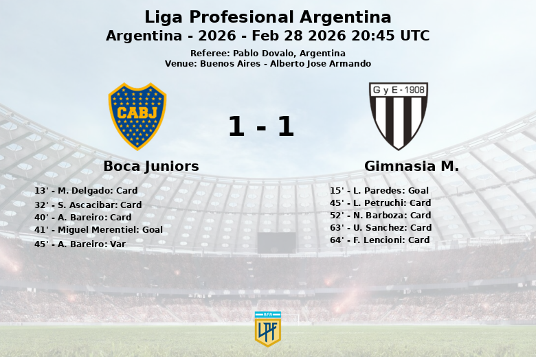 Buenos Aires, Argentina – En un partido disputado en el Alberto José Armando, Boca Juniors y Gimnasia M. igualaron en un encuentro marcado por la intensidad y las tarjetas. Gimnasia M. sorprendió al principio con un gol de L. Paredes al minuto 15, con asistencia de F. Lencioni. Boca Juniors respondió con un gol de M. Merentiel al minuto 41, asistido por A. Bareiro, aunque un gol previo del mismo Bareiro fue anulado por fuera de juego tras revisión del VAR.
