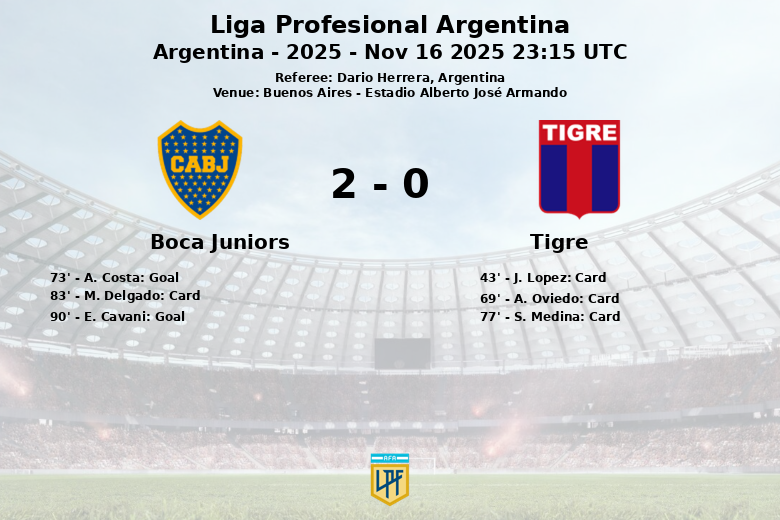 El marcador se abrió en el minuto 73, gracias a un gol de A. Costa, asistido por L. Paredes. La victoria se selló en el minuto 90 con un penal convertido por E. Cavani. El árbitro del partido, Dario Herrera, tuvo una labor exigente en un encuentro donde la intensidad se mantuvo hasta el último minuto. Con este resultado, Boca Juniors suma puntos valiosos en su búsqueda por escalar posiciones en la liga.