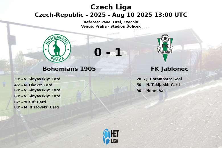 Bohemians 1905 vs FK Jablonec Aug 10 2025 13:00 UTC