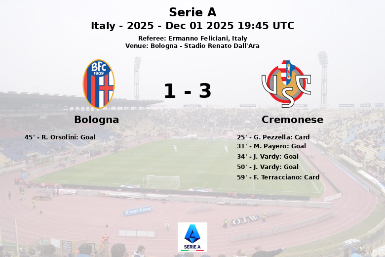En la segunda mitad, Vardy volvió a marcar para el Cremonese en el minuto 50, asistido por T. Barbieri, consolidando la victoria para su equipo. El partido se caracterizó por un juego intenso, con dos tarjetas amarillas mostradas al Cremonese a G. Pezzella (minuto 25) y F. Terracciano (minuto 59). A pesar del dominio territorial del Bologna, que generó 28 disparos (6 a puerta y 15 fuera) y 12 saques de esquina, la solidez defensiva y la efectividad del Cremonese fueron determinantes para el resultado final. El árbitro Ermanno Feliciani dirigió el encuentro sin mostrar tarjetas rojas a ninguno de los equipos.