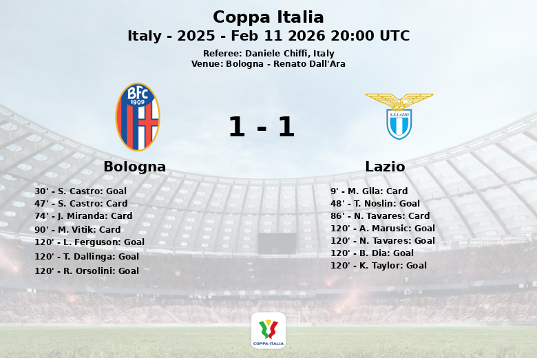 El tiempo reglamentario y la prórroga concluyeron sin más goles, llevando el partido a la definición desde los once pasos. En una tensa tanda de penales, la Lazio demostró mayor precisión, anotando cuatro de sus disparos, mientras que el Bologna falló dos de sus intentos, incluyendo el decisivo. El partido finalizó con el marcador mostrando que la Lazio anotó cuatro penales, contra tres del Bologna.