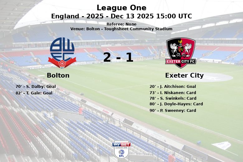 Exeter City, con solo un 36% de posesión y escasos 2 disparos (uno a puerta), se vio superado por el juego de Bolton. La frustración se hizo evidente con la acumulación de cuatro tarjetas amarillas. Bolton, por su parte, mantuvo la compostura y no recibió ninguna amonestación. El partido finalizó con un marcador de 2 a 1 a favor del equipo local.