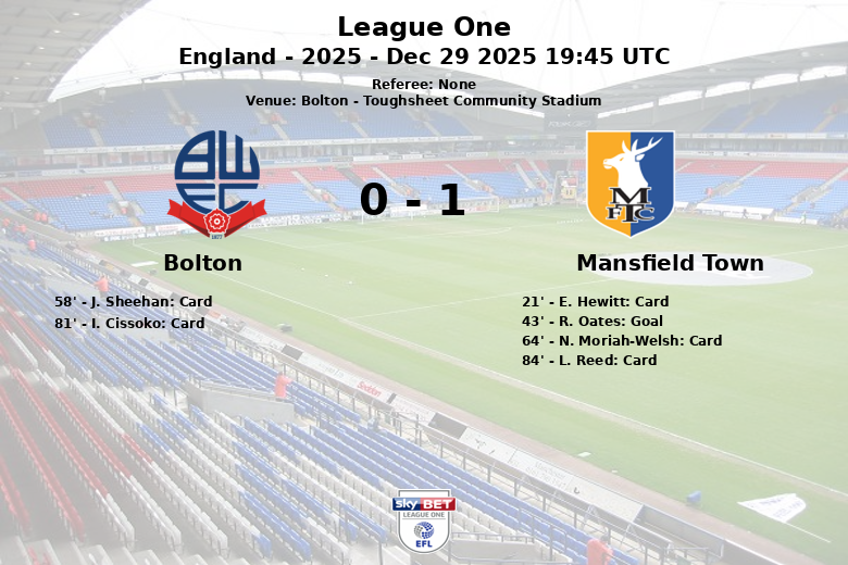 Bolton, Inglaterra – En un partido disputado en el Toughsheet Community Stadium, el Mansfield Town logró una victoria sorprendente sobre el Bolton en la jornada 23 de la League One. A pesar de la abrumadora posesión del balón por parte del Bolton (79%), el Mansfield Town demostró efectividad y solidez defensiva para asegurar los tres puntos.