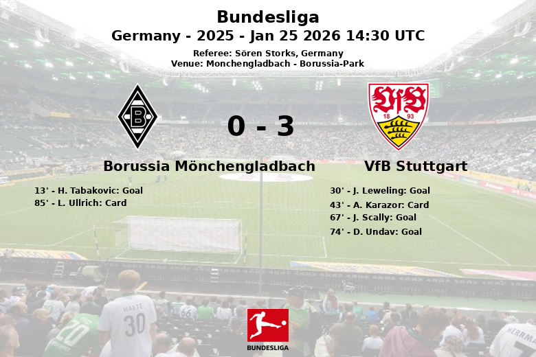 En un partido disputado en el Borussia-Park de Monchengladbach, el VfB Stuttgart se impuso con una sólida victoria. A pesar de que el Borussia Mönchengladbach abrió el marcador temprano con un gol de H. Tabakovic en el minuto 13 tras un penalti fallado, el Stuttgart respondió con fuerza. J. Leweling igualó el encuentro en el minuto 30. La primera mitad concluyó con una tarjeta amarilla para A. Karazor del Stuttgart.