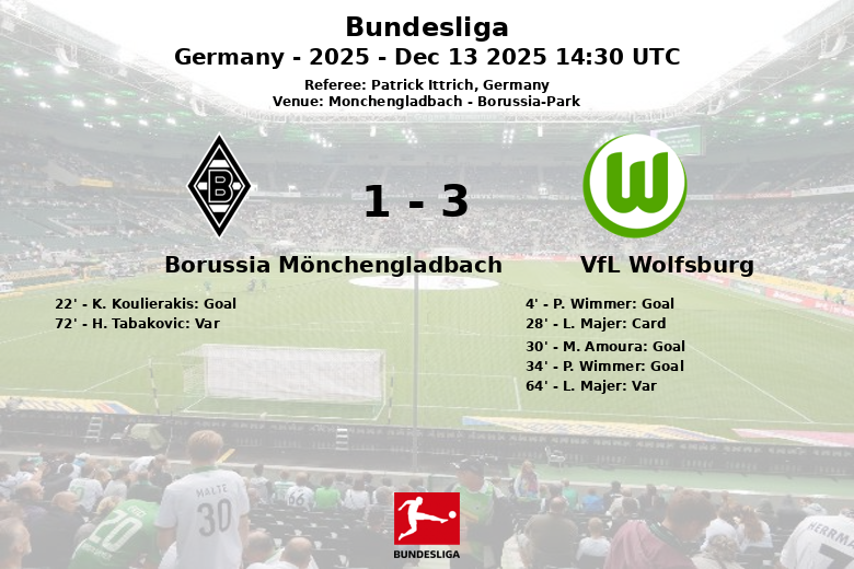 Monchengladbach, Alemania – El VfL Wolfsburg se impuso con autoridad al Borussia Mönchengladbach en el Borussia-Park, en un partido correspondiente a la jornada 14 de la Bundesliga. El encuentro, disputado bajo el arbitraje de Patrick Ittrich, finalizó con una victoria que refleja la efectividad ofensiva del Wolfsburg, a pesar de tener una menor posesión del balón (43% frente al 57% del Gladbach).
