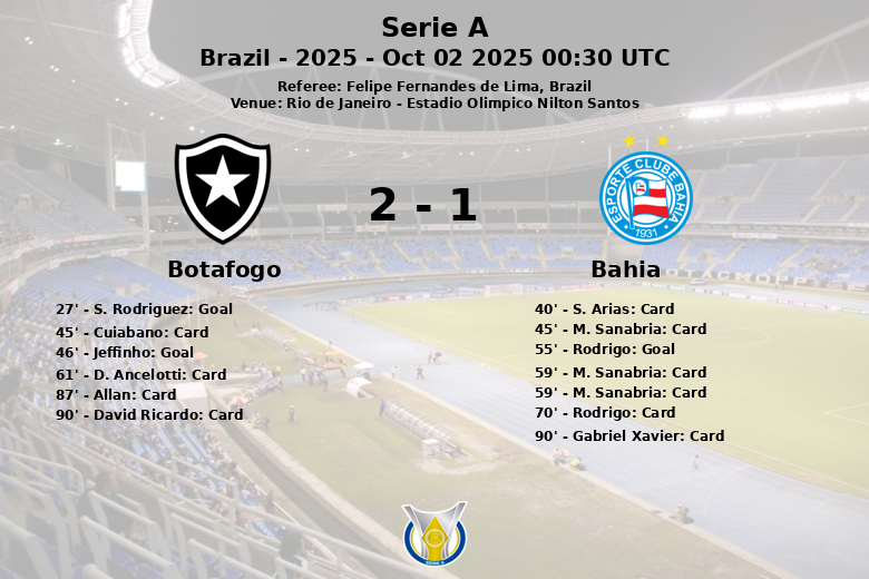 Río de Janeiro, Brasil – En un encuentro disputado en el Estadio Olímpico Nilton Santos, Botafogo logró una victoria sobre Bahia en la jornada 26 de la Serie A brasileña. El partido, arbitrado por Felipe Fernandes de Lima, fue un festival de tarjetas y goles, donde la disciplina jugó un papel crucial.