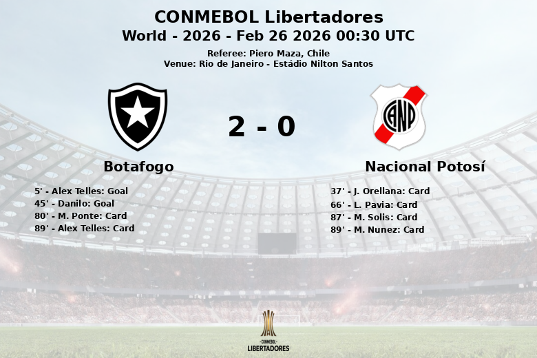 A pesar de los esfuerzos del Nacional Potosí, el Botafogo mantuvo su ventaja y controló el partido hasta el final. El equipo carioca demostró su superioridad con 16 tiros, de los cuales 6 fueron a puerta, en comparación con los 7 tiros del Nacional Potosí, con solo 3 a puerta. El árbitro chileno Piero Maza dirigió el encuentro, que terminó con la victoria del Botafogo y una demostración de su potencial en la CONMEBOL Libertadores.