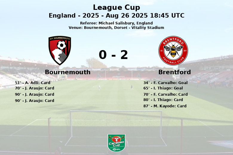 Bournemouth, Dorset – En un encuentro cargado de intensidad y tarjetas, el Brentford se impuso al Bournemouth en el Vitality Stadium en la segunda ronda de la League Cup. El partido, disputado bajo la atenta mirada del árbitro Michael Salisbury, culminó con un resultado que refleja la efectividad del Brentford frente a la posesión dominante del Bournemouth.