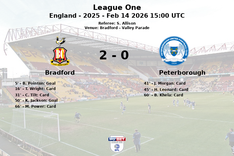 El Bradford controló el 55% de la posesión, generando un total de 28 tiros, de los cuales 10 fueron dirigidos a puerta y 9 se desviaron. La ofensiva local encontró su recompensa tempranamente, con un gol de B. Pointon a los 5 minutos, gracias a una jugada elaborada sin asistencia directa. Ya en la segunda mitad, K. Jackson amplió la ventaja a los 50 minutos con una anotación asistida por J. Neufville.