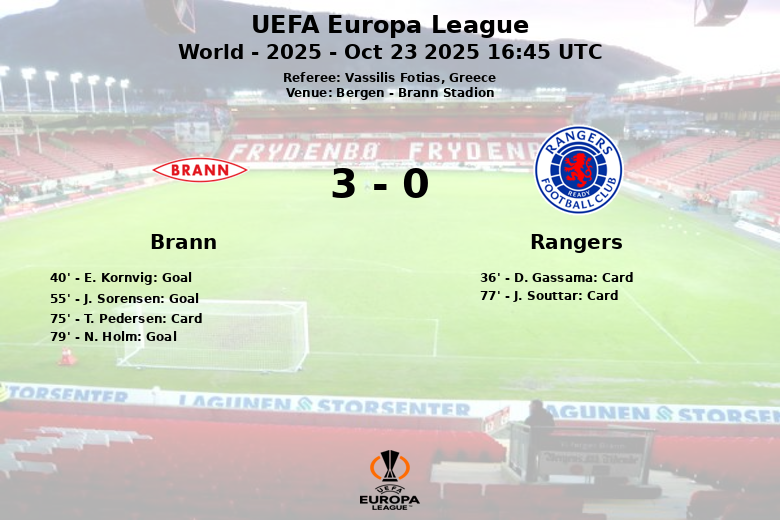 Los Rangers, por su parte, tuvieron dificultades para generar peligro, logrando solo 8 disparos, de los cuales solo uno fue a puerta. A pesar de un esfuerzo constante, los escoceses no lograron inquietar la portería rival. El partido también vio la amonestación de D. Gassama y J. Souttar por parte de los Rangers, mientras que T. Pedersen recibió una tarjeta amarilla para el Brann. El encuentro, correspondiente a la tercera jornada de la fase de grupos de la UEFA Europa League, se caracterizó por el dominio del Brann, que supo aprovechar sus oportunidades para llevarse los tres puntos.