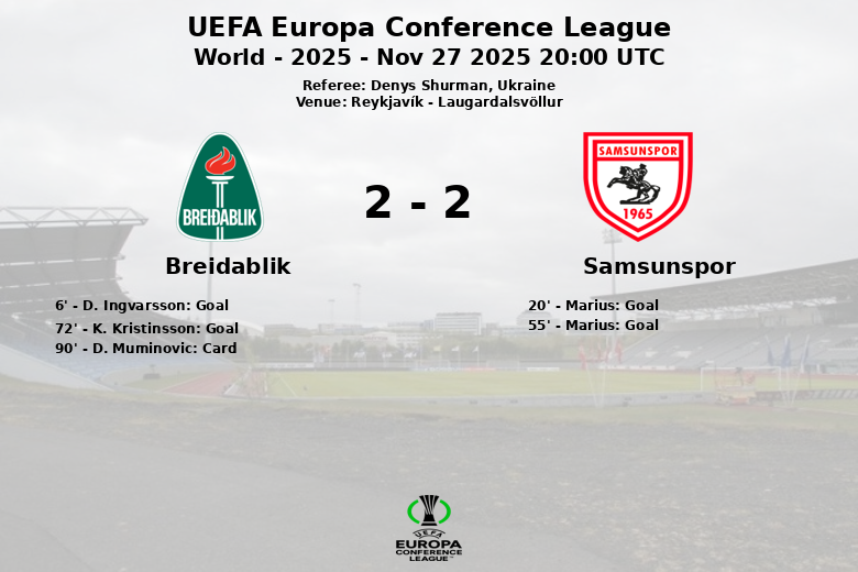 Reykjavík, Islandia – En un partido vibrante disputado en el Laugardalsvöllur, el Samsunspor se llevó la victoria ante el Breidablik con un marcador de 2 a 3, en un encuentro correspondiente a la fase de grupos de la UEFA Europa Conference League. Desde el inicio, el Breidablik sorprendió al público local con un gol tempranero de D. Ingvarsson al minuto 6, asistido por A. Thorsteinsson, desatando la euforia en la afición islandesa. Sin embargo, el Samsunspor no tardó en responder, con Marius igualando el marcador al minuto 20, gracias a una excelente asistencia de A. Makoumbou.