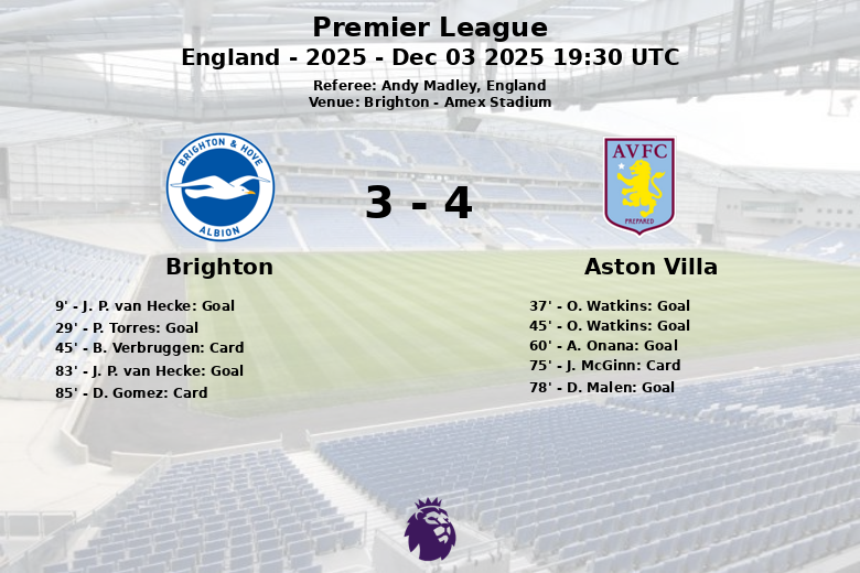 Brighton, Inglaterra – El Amex Stadium fue testigo de un encuentro vibrante y lleno de acción entre el Brighton y el Aston Villa, que culminó con un marcador de 3-5 a favor de los visitantes. El Brighton comenzó con fuerza, abriendo el marcador al minuto 9 gracias a un gol de J. P. van Hecke, asistido por M. Wieffer. Ampliaron su ventaja al minuto 29 con un autogol de P. Torres. Sin embargo, el Aston Villa reaccionó con contundencia. O. Watkins descontó al minuto 37, asistido por E. Guessand, y empató el partido justo antes del descanso, al minuto 45, con asistencia de M. Rogers.