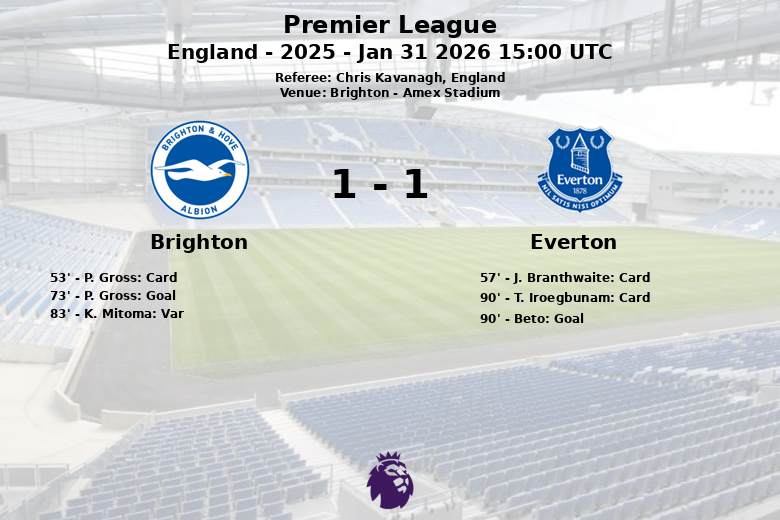 El gol que abrió el marcador llegó en el minuto 73, cuando Pascal Gross, asistido por Y. Ayari, anotó para el Brighton. Parecía que el equipo local se llevaría la victoria, pero en el minuto 90, Beto logró igualar el marcador para el Everton, sin asistencia aparente. Un gol de Mitoma para el Brighton fue anulado por el VAR en el minuto 83 debido a un fuera de juego, lo que aumentó la tensión en los minutos finales. A pesar del dominio del Brighton en la posesión y los corners (5 contra 2), el Everton demostró efectividad al aprovechar una de sus pocas oportunidades para llevarse un punto valioso de Brighton.
