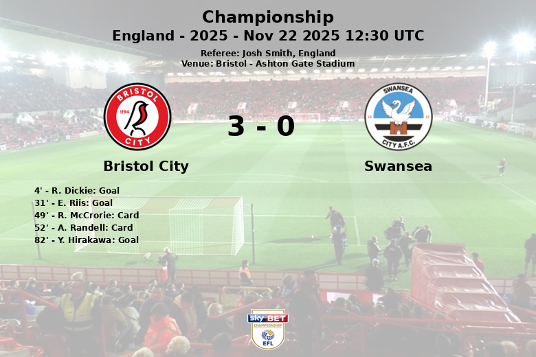 Bristol, Inglaterra – El Bristol City se impuso con autoridad al Swansea en un partido disputado en el Ashton Gate Stadium, correspondiente a la jornada 16 de la Championship. Desde el inicio, los locales mostraron su determinación, abriendo el marcador al minuto 4 con un gol de R. Dickie tras una asistencia de A. Mehmeti. La conexión Mehmeti-Riis volvió a ser letal al minuto 31, ampliando la ventaja para el Bristol City.