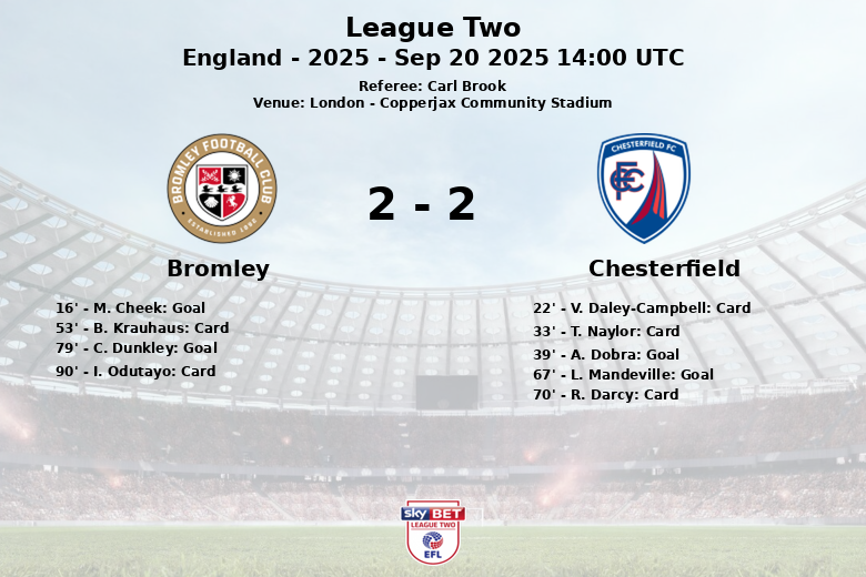 En un encuentro correspondiente a la novena jornada de la League Two, el Chesterfield se llevó la victoria del Copperjax Community Stadium de Londres tras vencer al Bromley. El partido, arbitrado por Carl Brook, se caracterizó por la alta posesión del balón por parte del Chesterfield (66%) frente al 34% del Bromley.