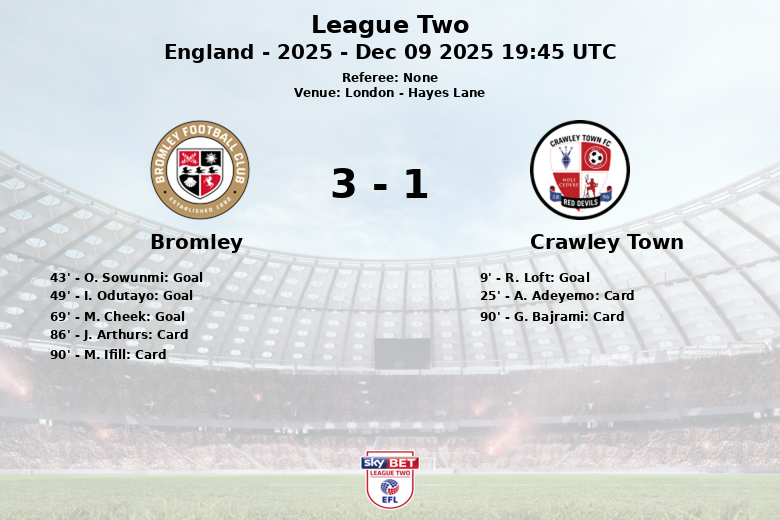 En un vibrante encuentro disputado en Hayes Lane, Bromley se impuso a Crawley Town en un partido lleno de alternativas. Crawley Town golpeó primero al minuto 9 con un gol de R. Loft, tras una asistencia de H. McKirdy, poniendo el marcador 0-1. Sin embargo, Bromley reaccionó antes del descanso, igualando las acciones al minuto 43 gracias a O. Sowunmi, quien aprovechó un pase de M. Pinnock.