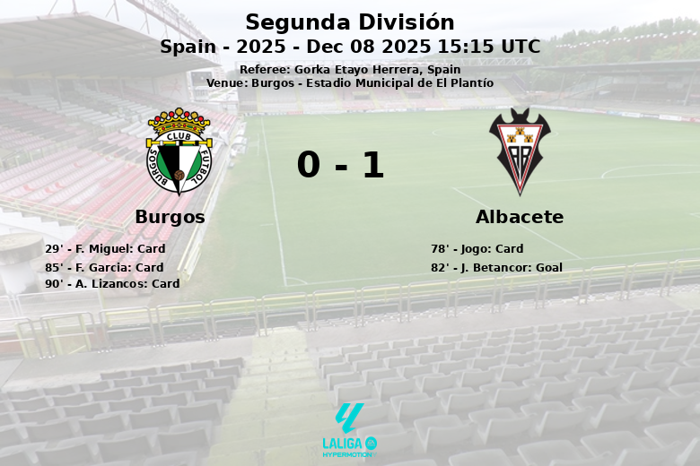 Burgos, España – En un partido reñido disputado en el Estadio Municipal de El Plantío, el Albacete logró imponerse al Burgos con un gol de J. Betancor en el minuto 82, asistido por Pepe. El encuentro, válido por la fecha 17 de la Segunda División, fue arbitrado por Gorka Etayo Herrera.
