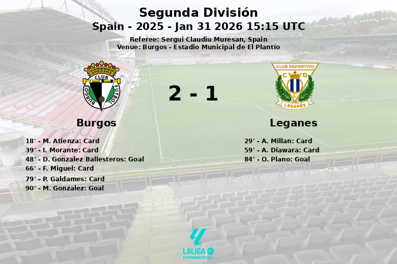 El Burgos abrió el marcador al minuto 48 gracias a un gol de D. Gonzalez Ballesteros, asistido por I. Cordoba, desatando la euforia en la afición local. El Leganés, sin embargo, no se rindió y A. Diawara recibió una tarjeta amarilla al minuto 59. El Burgos también acumuló tarjetas amarillas para F. Miguel (66′) y P. Galdames (79′).