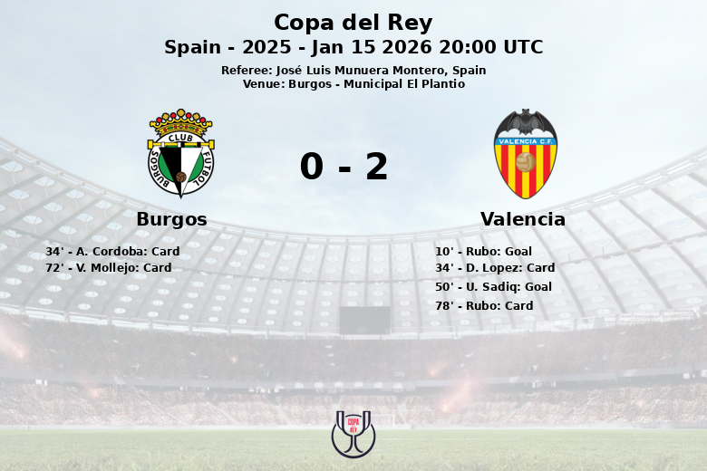 En la segunda mitad, el Valencia amplió su ventaja al minuto 50 gracias a un gol de U. Sadiq, asistido por L. Ramazani. A pesar del esfuerzo del Burgos por reducir la diferencia, el Valencia supo mantener la posesión del balón y controlar el ritmo del partido. La intensidad del juego se mantuvo alta, lo que derivó en una nueva amonestación para V. Mollejo del Burgos al minuto 72 y para Rubo del Valencia al minuto 78.