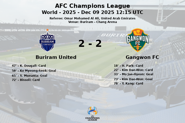 En la segunda mitad, Buriram United reaccionó con fuerza. Primero, Ko Myeong-Seok igualó las acciones al minuto 58 y luego S. Mueanta adelantó a los locales al minuto 65. Sin embargo, Gangwon FC no se rindió y Kim Dae-Won convirtió un penal al minuto 73 para sellar el empate final. El partido fue muy disputado, con un total de 16 tiros para Buriram United y 10 para Gangwon FC, reflejando la paridad en el juego. El árbitro del encuentro, Omar Mohamed Al Ali, mostró varias tarjetas amarillas a lo largo del encuentro, evidenciando la intensidad del choque. El partido se jugó en el contexto de la fase de grupos de la AFC Champions League, temporada 2025.