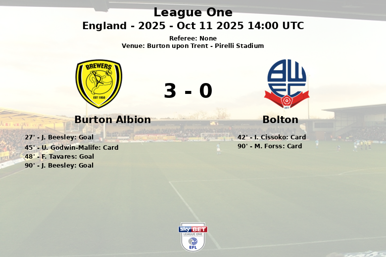 En el segundo tiempo, F. Tavares amplió la ventaja para el Burton Albion en el minuto 48. Aunque el Bolton intentó reaccionar, la defensa del Burton se mantuvo firme. Ya en el tiempo añadido, J. Beesley volvió a marcar para el Burton Albion en el minuto 90, asistido por K. Lofthouse, sellando la victoria. El Bolton terminó con una tarjeta amarilla para M. Forss también en el tiempo agregado.