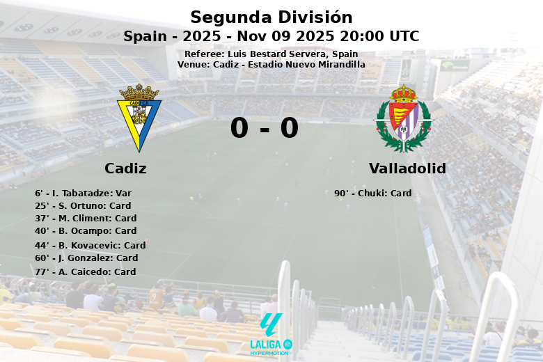 Cádiz, España – En un encuentro disputado en el Estadio Nuevo Mirandilla, el Cádiz y el Valladolid empataron 0-0 en un partido marcado por la intensidad y las numerosas infracciones. Bajo el arbitraje de Luis Bestard Servera, el encuentro de la jornada 13 de la Segunda División española estuvo reñido desde el principio, con un alto número de tarjetas amarillas mostradas al equipo local.