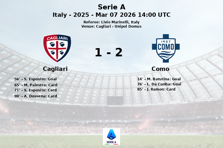 En un partido disputado en el Unipol Domus de Cagliari, Como y Cagliari empataron en un encuentro lleno de emoción y tarjetas. Como abrió el marcador en el minuto 14 con un gol de M. Baturina, asistido por L. Da Cunha. Cagliari respondió en la segunda mitad, al minuto 56, con un tanto de S. Esposito, gracias a una asistencia de A. Obert. Cuando parecía que el empate sería el resultado final, L. Da Cunha volvió a aparecer para el Como al minuto 76, marcando un gol con asistencia de I. Van der Brempt.