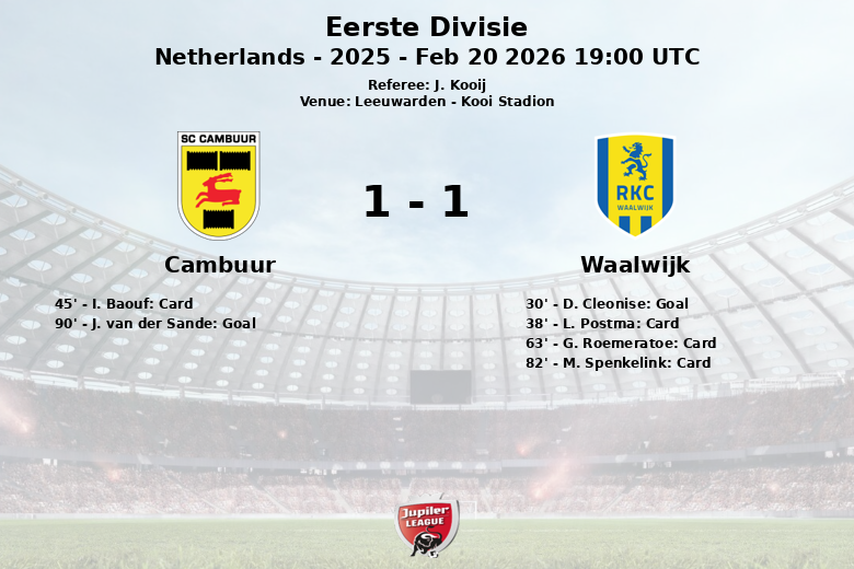 Leeuwarden, Países Bajos – En un partido disputado en el Kooi Stadion, Cambuur y Waalwijk empataron en un encuentro que dejó mucho que desear en cuanto a fluidez. El partido, válido por la fecha 28 de la Eerste Divisie, estuvo marcado por un alto número de faltas (21 para Waalwijk y 9 para Cambuur) y tarjetas amarillas (3 para Waalwijk y 1 para Cambuur).