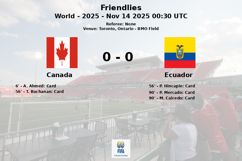 El partido se vio marcado por una temprana tarjeta roja para Canadá en el minuto 6, lo que condicionó el resto del encuentro. Ecuador recibió tres tarjetas amarillas, mientras que Canadá sumó una amarilla y la mencionada roja. En cuanto a las ocasiones de gol, Canadá registró cuatro tiros, uno a puerta y uno fuera, además de cuatro tiros de esquina, en contraste con los tres tiros desviados y dos tiros de esquina de Ecuador. El partido, correspondiente a la fecha de amistosos del 14 de noviembre de 2025, dejó a la afición local con la sensación de una oportunidad perdida para evaluar el progreso de su selección ante un rival de mayor jerarquía.