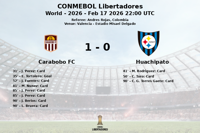 El único gol del partido llegó al minuto 35, obra de E. Tortolero, quien aprovechó una asistencia de E. Ramirez para adelantar al equipo local. Si bien Huachipato mantuvo una ligera ventaja en la posesión del balón (51% frente al 49% de Carabobo), no logró concretar sus oportunidades de gol.