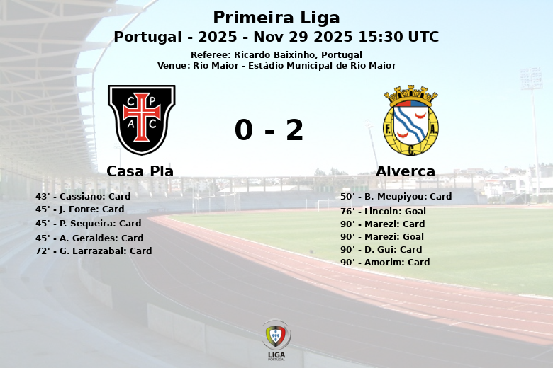 Rio Maior, Portugal – En un partido cargado de emociones y controversia, el Alverca se impuso al Casa Pia en el Estádio Municipal de Rio Maior. El encuentro, válido por la jornada 12 de la Primeira Liga, estuvo marcado por la disciplina, la cual fue sancionada con tarjetas amarillas y una tarjeta roja.