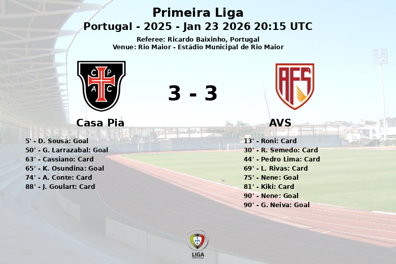 Rio Maior, Portugal – En un partido vibrante y lleno de alternativas, Casa Pia y AVS igualaron en un encuentro disputado en el Estádio Municipal de Rio Maior, correspondiente a la jornada 19 de la Primeira Liga. El partido, arbitrado por Ricardo Baixinho, estuvo marcado por la intensidad y la cantidad de tarjetas amarillas mostradas.