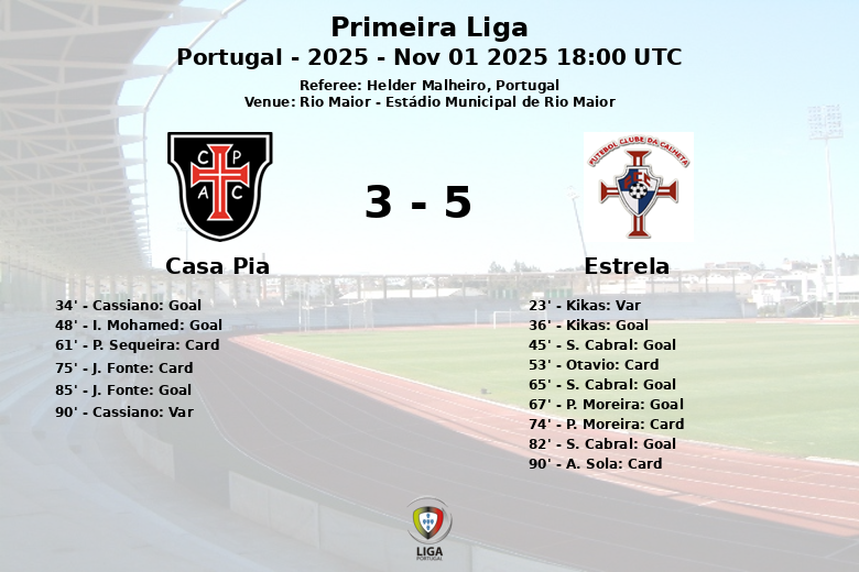 El partido comenzó con un gol anulado al Estrela en el minuto 23 por fuera de juego. El Casa Pia abrió el marcador en el minuto 34 con un gol de Cassiano, asistido por K. Nsona, pero la alegría duró poco, ya que Kikas igualó para el Estrela dos minutos después. Al filo del descanso, S. Cabral adelantó al Estrela con un gol de penalti.