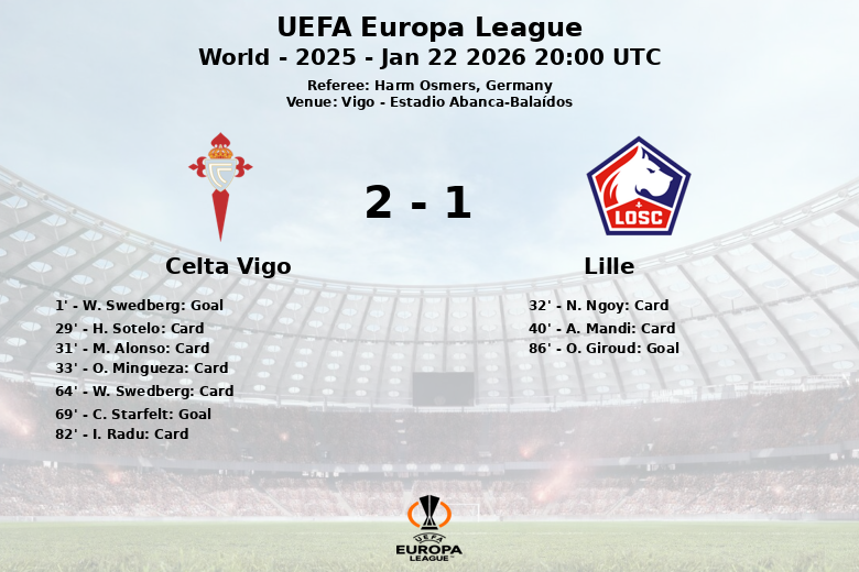 Vigo fue testigo de un partido trepidante en la UEFA Europa League donde el Celta Vigo y el Lille empataron en un encuentro cargado de emoción y controversia. El Celta Vigo, con un porcentaje de posesión de balón del 26%, sorprendió al inicio con un gol tempranero de W. Swedberg en el minuto 1, asistido por I. Aspas. Sin embargo, la alegría celeste se vio empañada con la expulsión de H. Sotelo en el minuto 29, obligando al equipo a replantear su estrategia con un hombre menos. El partido se volvió tenso, con varias tarjetas amarillas mostradas a ambos bandos. A pesar de la inferioridad numérica, el Celta Vigo logró ampliar su ventaja con un gol de C. Starfelt en el minuto 69, con asistencia de M. Roman. Cuando parecía que la victoria se quedaría en casa, O. Giroud del Lille marcó en el minuto 86, igualando el marcador y sellando un empate que reflejó la intensidad del encuentro. A pesar del dominio del Lille en la posesión del balón (74%), el Celta Vigo demostró garra y capacidad para competir, especialmente tras la expulsión.