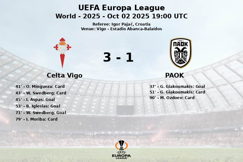 En un encuentro disputado en el Estadio Abanca-Balaídos, el Celta Vigo logró una importante victoria sobre el PAOK en la segunda jornada de la fase de grupos de la UEFA Europa League. El partido, arbitrado por el croata Igor Pajač, se caracterizó por el dominio del balón del Celta (62% de posesión) y un juego ofensivo más incisivo, aunque el PAOK mostró destellos de peligro.