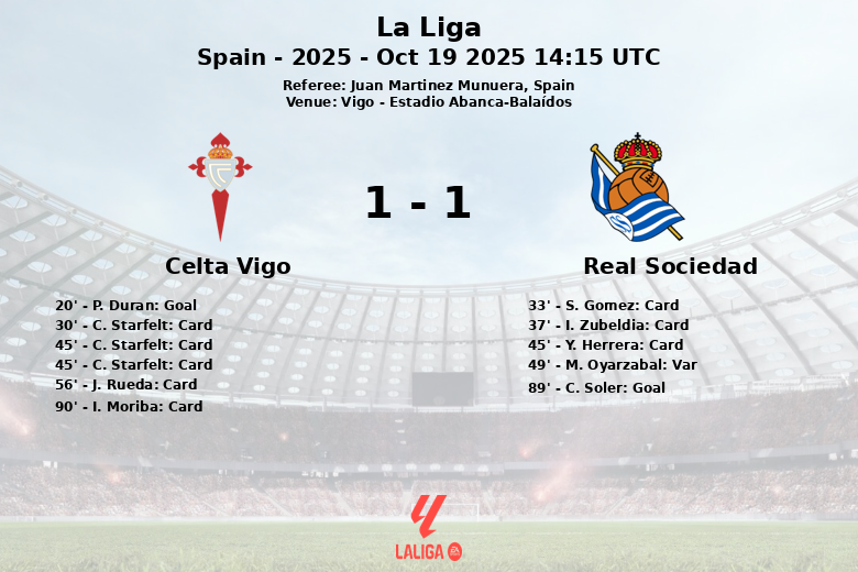 Vigo, España – En un encuentro cargado de tensión y polémica en el Estadio Abanca-Balaídos, el Celta Vigo y la Real Sociedad igualaron con un marcador de 1-1. El partido, correspondiente a la novena jornada de La Liga, estuvo marcado por las numerosas tarjetas, la expulsión de Starfelt al filo del descanso y un gol anulado a Oyarzabal por fuera de juego.