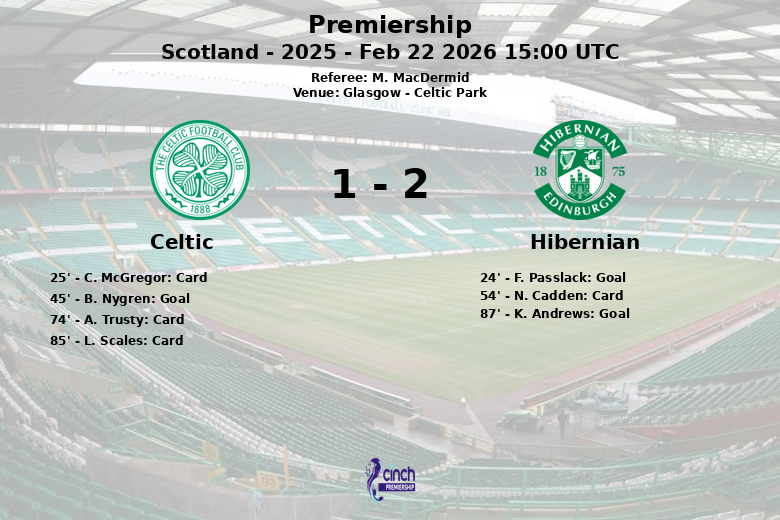 A pesar de la superioridad en la posesión y los tiros a puerta, el Celtic no pudo llevarse la victoria, mientras que Hibernian, efectivo en sus llegadas, se llevó un valioso punto de su visita a Glasgow. El árbitro M. MacDermid mostró varias tarjetas amarillas y una roja, reflejando la intensidad del encuentro.