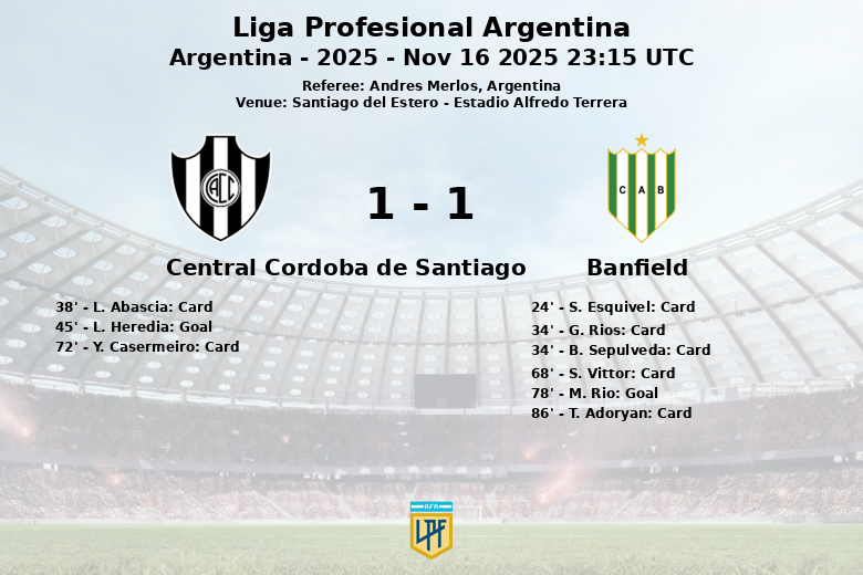 La primera mitad finalizó con Central Córdoba en ventaja gracias a un gol de L. Heredia al minuto 45. Sin embargo, Banfield reaccionó en la segunda parte, encontrando el empate al minuto 78 con un gol de M. Rio, asistido por G. Rios.