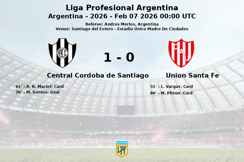 Santiago del Estero – En un encuentro parejo y con mucho roce, Central Córdoba de Santiago logró imponerse a Unión de Santa Fe en el Estadio Único Madre de Ciudades. El partido, correspondiente a la cuarta fecha de la Liga Profesional Argentina, se definió en los últimos minutos gracias a un gol de M. Santos al minuto 76, con asistencia de M. Iacobellis.