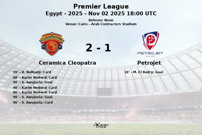 Sin embargo, el Ceramica Cleopatra no se rindió y logró el empate a través de dos goles agónicos de S. Awujoola. El primero de penal en el minuto 90, y el segundo también en el 90′, tras una asistencia de M. Sadek. Awujoola fue amonestado al final del encuentro.
