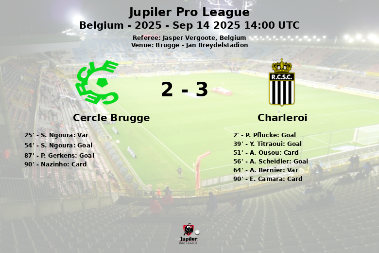 El Cercle Brugge intentó reaccionar, pero un gol de S. Ngoura fue anulado por fuera de juego mediante el VAR al minuto 25. Charleroi, lejos de conformarse, amplió su ventaja al minuto 39 gracias a Y. Titraoui, asistido por A. Scheidler.