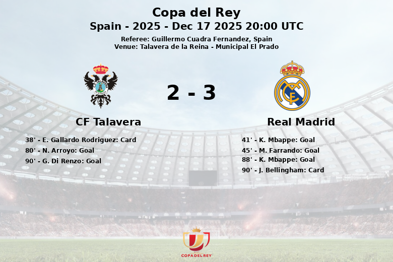 El CF Talavera mostró signos de vida en el segundo tiempo, con un gol de N. Arroyo al minuto 80, asistido por M. Farrando, acortando distancias en el marcador. Sin embargo, K. Mbappe volvió a marcar al minuto 88, esta vez con asistencia de A. Tchouameni, ampliando la ventaja para el Real Madrid. En el tiempo añadido, G. Di Renzo anotó para el CF Talavera al minuto 90, pero no fue suficiente para cambiar el resultado.
