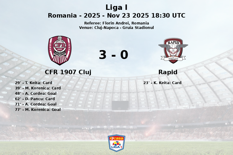 En un partido disputado en el Gruia Stadionul de Cluj-Napoca, el CFR 1907 Cluj se impuso con contundencia al Rapid, demostrando superioridad en la segunda mitad del encuentro. A pesar de que el Rapid dominó la posesión del balón con un 62%, no logró traducirlo en oportunidades claras de gol, con tan solo un remate al arco rival.
