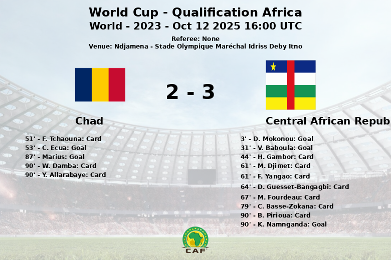 En un encuentro disputado en el Stade Olympique Maréchal Idriss Deby Itno de Ndjamena, República Centroafricana venció a Chad en un partido correspondiente a la fase de clasificación para el Mundial. El encuentro, jugado el 12 de octubre de 2025, estuvo marcado por la intensidad y las numerosas amonestaciones.