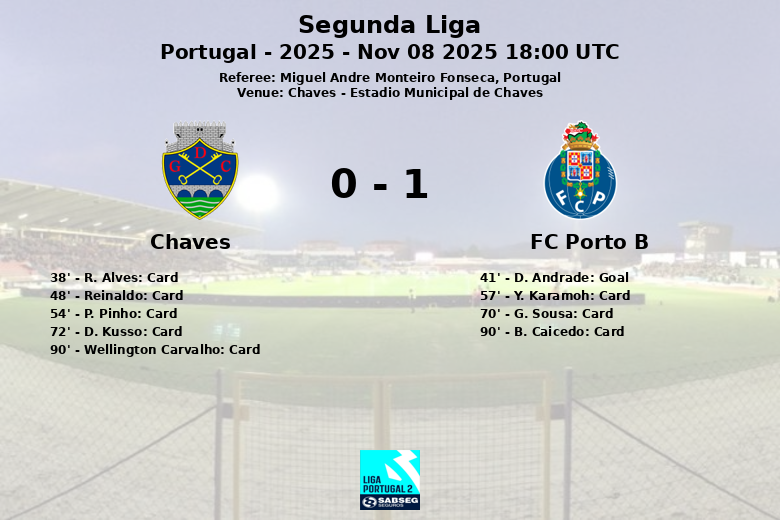 Chaves, Portugal – El Estadio Municipal de Chaves fue testigo de un encuentro tenso y disputado correspondiente a la jornada 11 de la Segunda Liga, donde el FC Porto B se llevó la victoria ante el Chaves. El único gol del partido llegó al minuto 41, obra de D. Andrade para el FC Porto B.