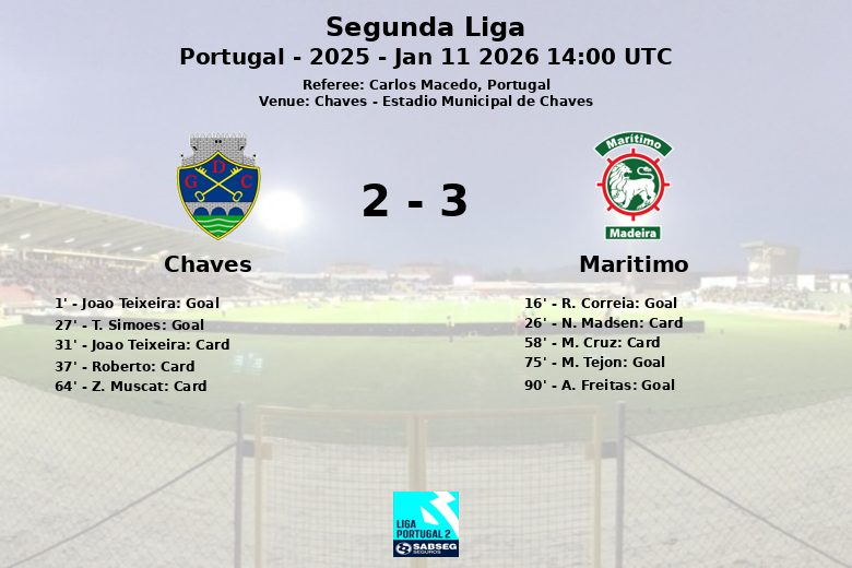 El Chaves tomó la delantera apenas al primer minuto con un gol de Joao Teixeira, asistido por R. Esajas, desatando la euforia en la grada local. Sin embargo, el Marítimo no tardó en responder, y a los 16 minutos R. Correia igualó el marcador. La alegría local se renovó cuando T. Simoes volvió a adelantar al Chaves al minuto 27.